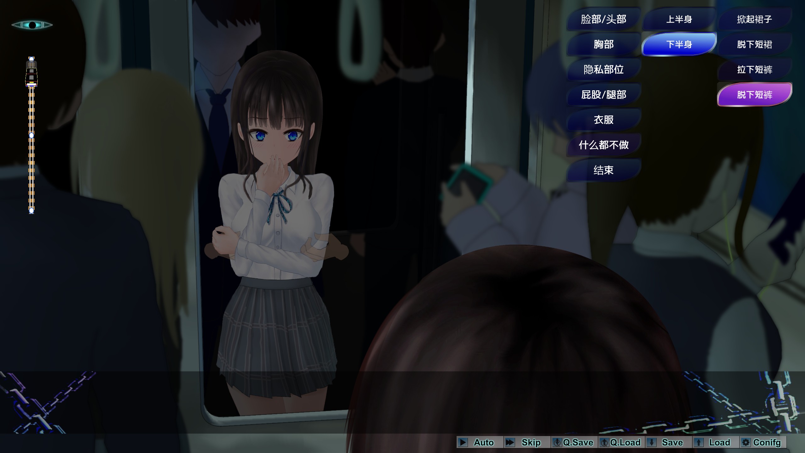 根据玩家的喜好,可以自由地色狼女主角身体的各个部位,穿脱衣服。可供选择的操作会随着女主角参数的增加而增加。