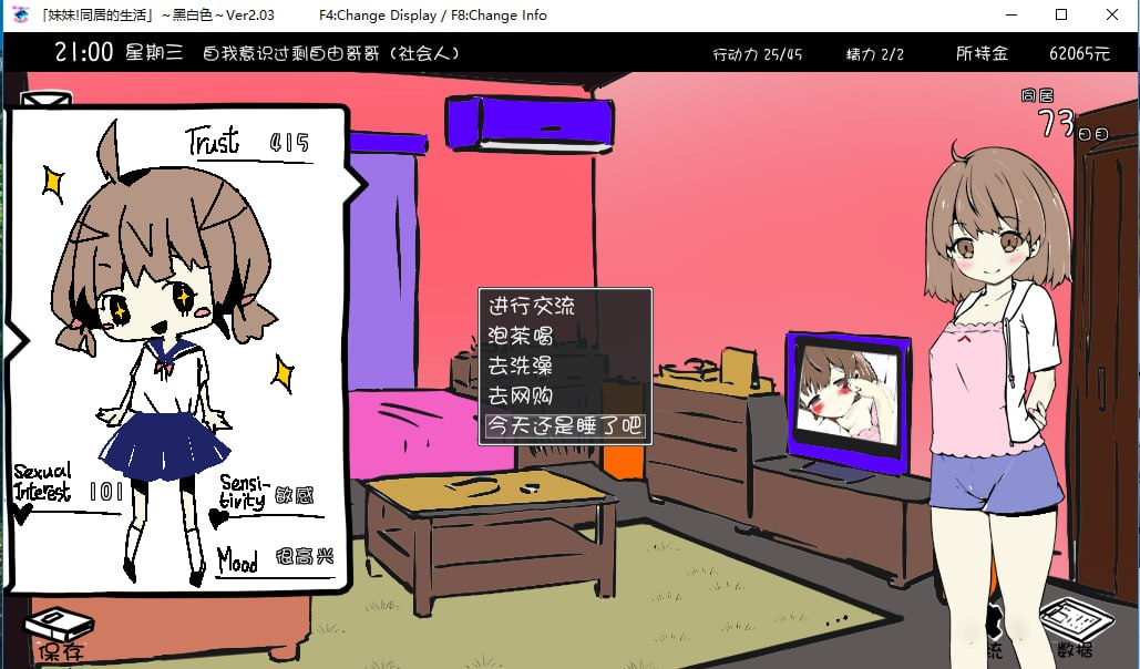 你是哥哥,和妹妹一起生活。上学、上班,也可能是每天都在家无所事事。在这样平凡的生活中,与妹妹进行身体接触。偷看妹妹洗澡,或者在睡着的时候偷袭。对于想要偷一次内裤试试看的人,也许非常值得推荐。并没有什么困难的操作,请轻松地开始游玩。
