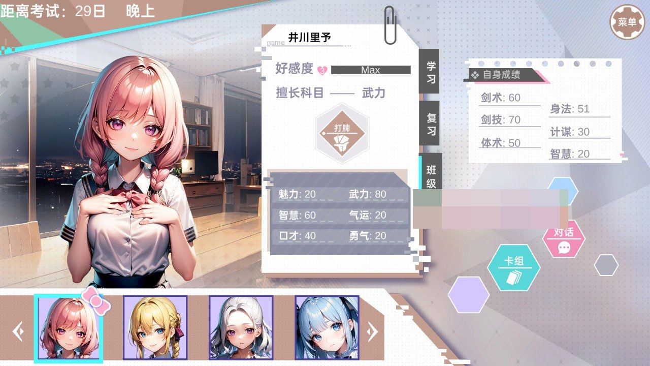 这是一款角色扮演游戏,玩家将扮演穿越者宇文火焰,通过学习复习来培养属性,与9名女性进行卡牌对战、收集卡牌、培养羁绊,解锁剧情,挑战老师和校长,目标回到原来的世界,但这一切真的有这么简单吗?宇文火焰可以顺利回到自己的世界吗?