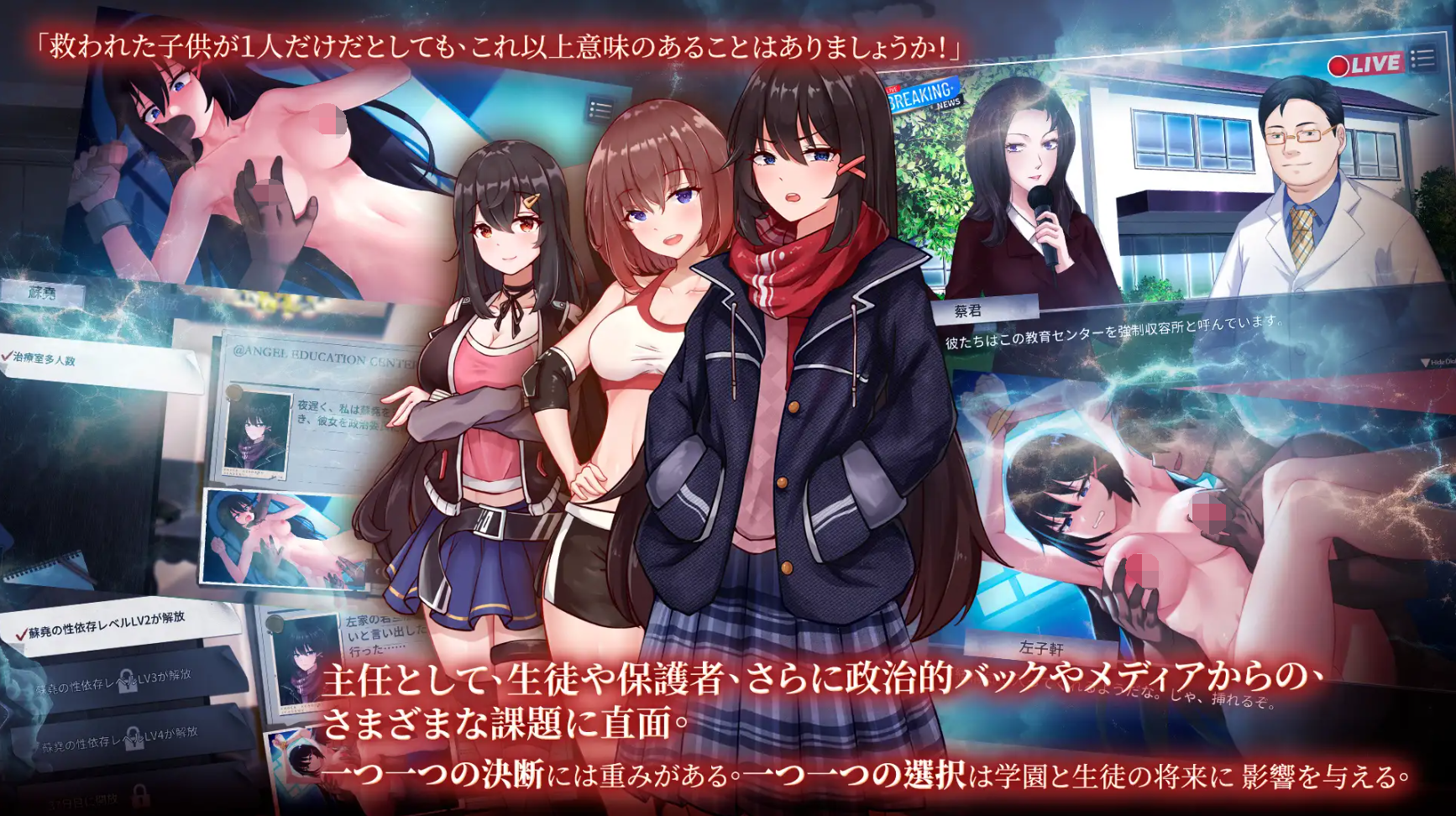 新生苏尧在进入天使教育中心后,便被选中成为了领导们的玩物。玩家所扮演的王久任将会与苏尧、张琪、徐莉莉3位少女相遇,并对她们展开调教。