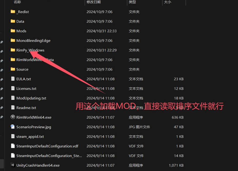 下载游戏后先启动一次,之后用rimpy程序加载排序文件启动MOD版就行