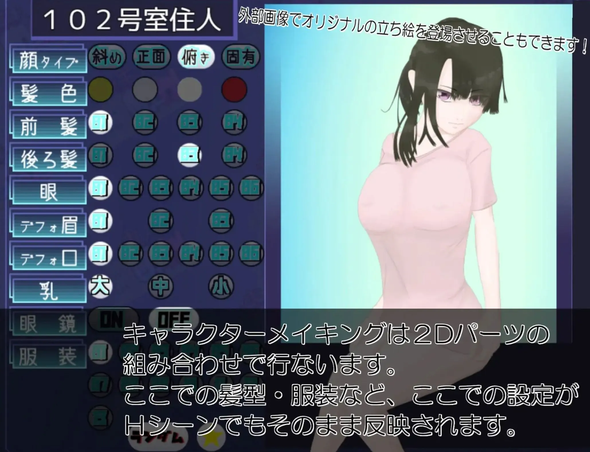 这是一款通过组合发型、脸型、瞳孔和服装的 2D 部件,来创建并布置公寓住户的游戏。