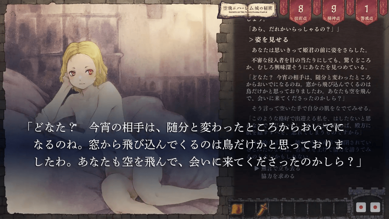 由LIMITCYCLE带来的游戏书风格香艳RPG第三弹,是一款为拯救被俘的公主而只身闯入谜之古城的王道故事。您将作为资深冒险者登上飞翔之城,运用自豪的智慧、勇气以及六种技能,驱散淫乱的城中女子和丑恶魔物的威胁,揭开城堡的秘密,救出美丽的公主。